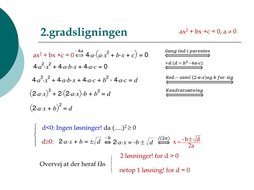 2.gradsligningen ax2 + bx +c = 0, a 0 ax2 + bx +c = 0 d<0: Ingen løsninger! da (.....)2 0 d0: 2 løsninger! for d > 0 Overvej at der heraf fås netop 1 løsning! for d = 0