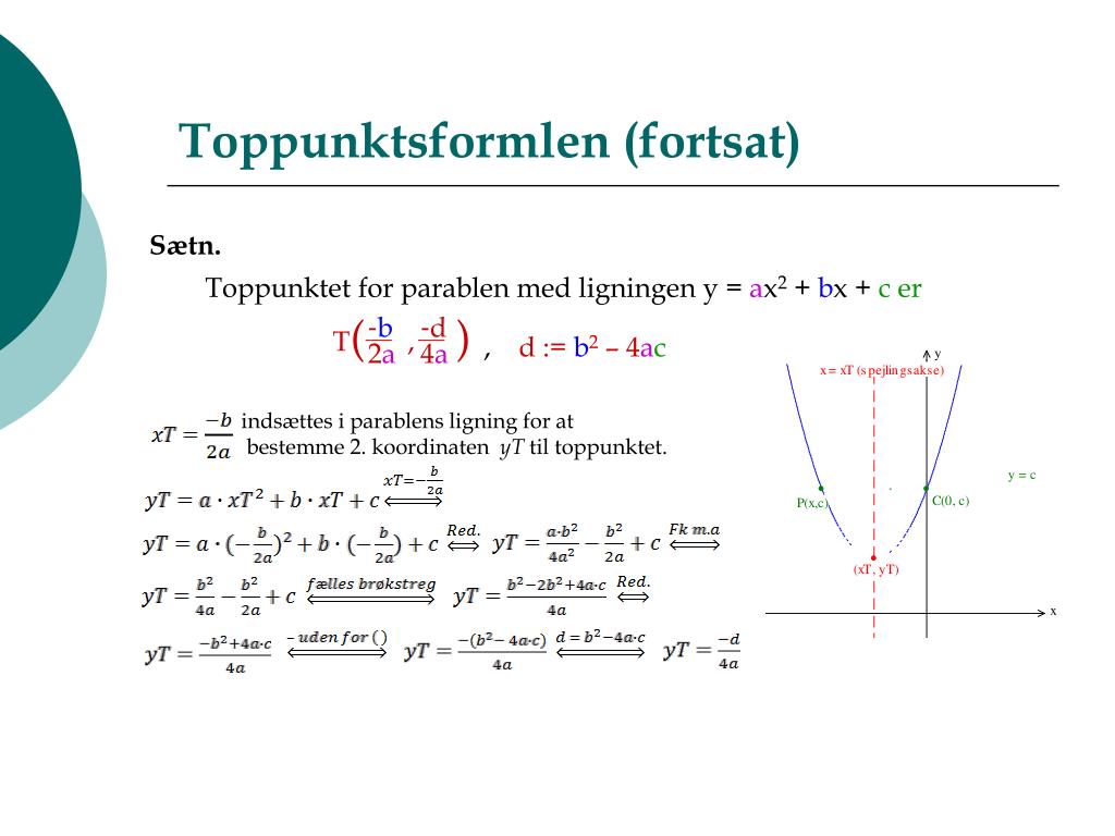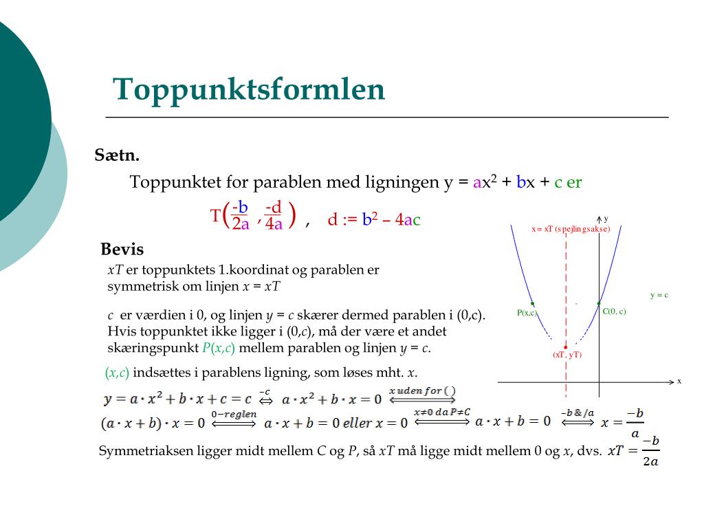 T( , ) -b -d 2a 4a Toppunktsformlen • Sætn. • Toppunktet for parablen med ligningen y = ax2 + bx + c er • , d := b2 – 4ac Bevis xT er toppunktets 1.koordinat og parablen er symmetrisk om linjen x = xT c er værdien i 0, og linjen y = c skærer dermed parablen i (0,c).Hvis toppunktet ikke ligger i (0,c), må der være et andet skæringspunkt P(x,c) mellem parablen og linjen y = c. (x,c) indsættes i parablens ligning, som løses mht. x. Symmetriaksen ligger midt mellem C og P, så xT må ligge midt mellem 0 og x, dvs.