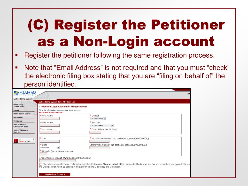 (C) Register the Petitioner as a Non-Login account • Register the petitioner following the same registration process. • Note that “Email Address” is not required and that you must “check” the electronic filing box stating that you are “filing on behalf of” the person identified.