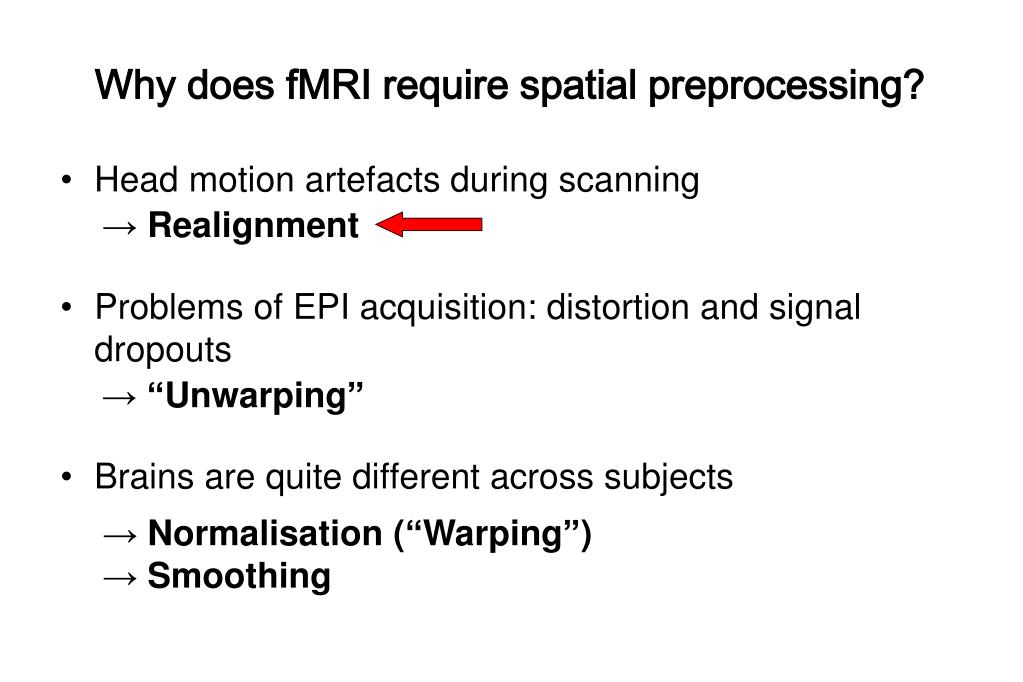 Why does fMRI require spatial preprocessing? • Head motion artefacts during scanning • Problems of EPI acquisition: distortion and signal dropouts • Brains are quite different across subjects → Realignment → “Unwarping” → Normalisation (“Warping”) → Smoothing