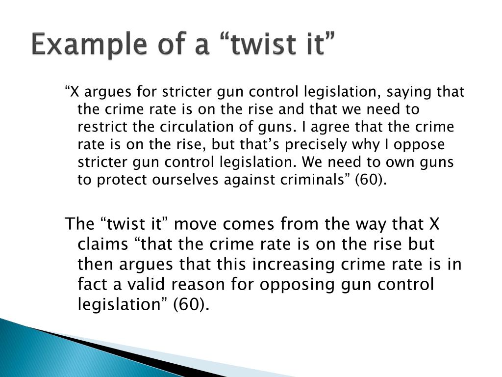 Example of a “twist it” “X argues for stricter gun control legislation, saying that the crime rate is on the rise and that we need to restrict the circulation of guns. I agree that the crime rate is on the rise, but that’s precisely why I oppose stricter gun control legislation. We need to own guns to protect ourselves against criminals” (60). The “twist it” move comes from the way that X claims “that the crime rate is on the rise but then argues that this increasing crime rate is in fact a valid reason for opposing gun control legislation” (60).