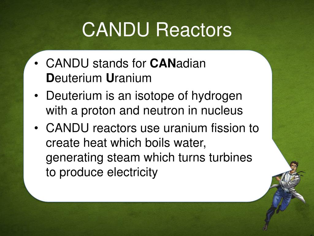 CANDU Reactors • CANDU stands for CANadianDeuterium Uranium • Deuterium is an isotope of hydrogen with a proton and neutron in nucleus • CANDU reactors use uranium fission to create heat which boils water, generating steam which turns turbines to produce electricity