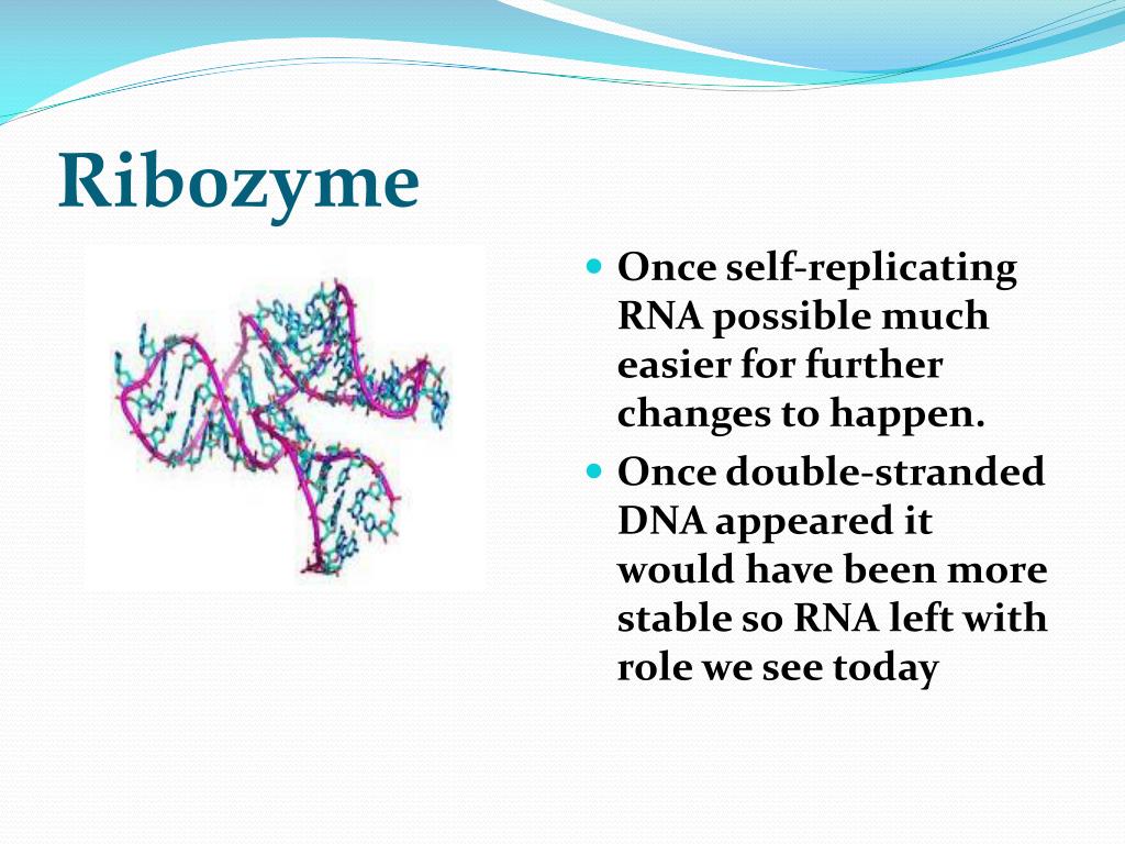 Ribozyme • Once self-replicating RNA possible much easier for further changes to happen. • Once double-stranded DNA appeared it would have been more stable so RNA left with role we see today