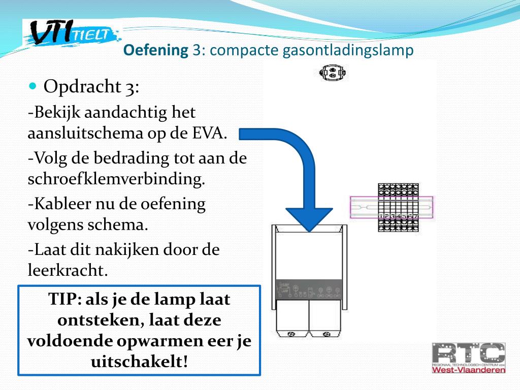 Oefening 3: compactegasontladingslamp • Opdracht 3: -Bekijk aandachtig het aansluitschema op de EVA. -Volg de bedrading tot aan de schroefklemverbinding. -Kableer nu de oefening volgens schema. -Laat dit nakijken door de leerkracht. TIP: als je de lamp laat ontsteken, laat deze voldoende opwarmen eer je uitschakelt!