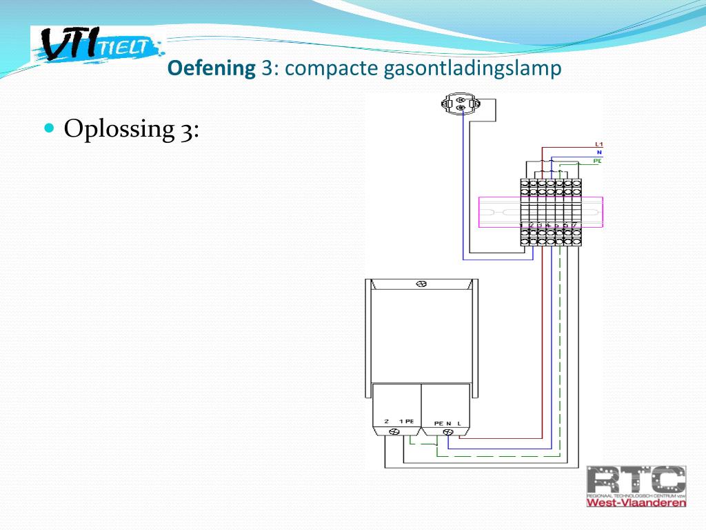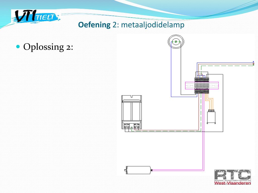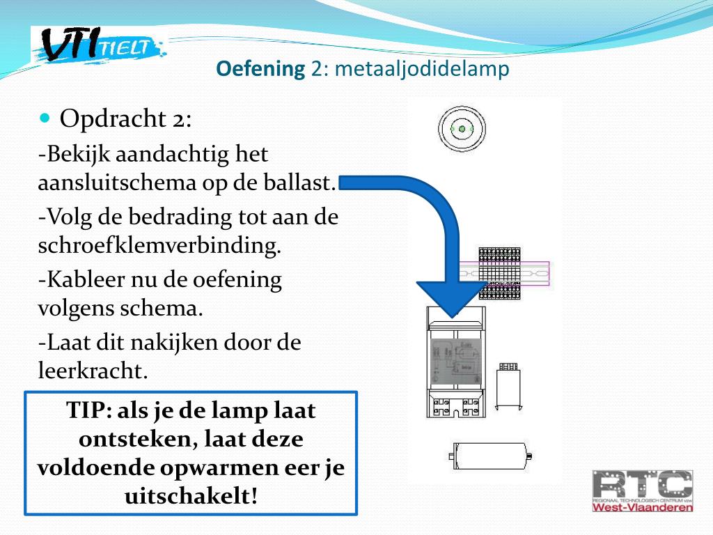 Oefening 2: metaaljodidelamp • Opdracht 2: -Bekijk aandachtig het aansluitschema op de ballast. -Volg de bedrading tot aan de schroefklemverbinding. -Kableer nu de oefening volgens schema. -Laat dit nakijken door de leerkracht. TIP: als je de lamp laat ontsteken, laat deze voldoende opwarmen eer je uitschakelt!