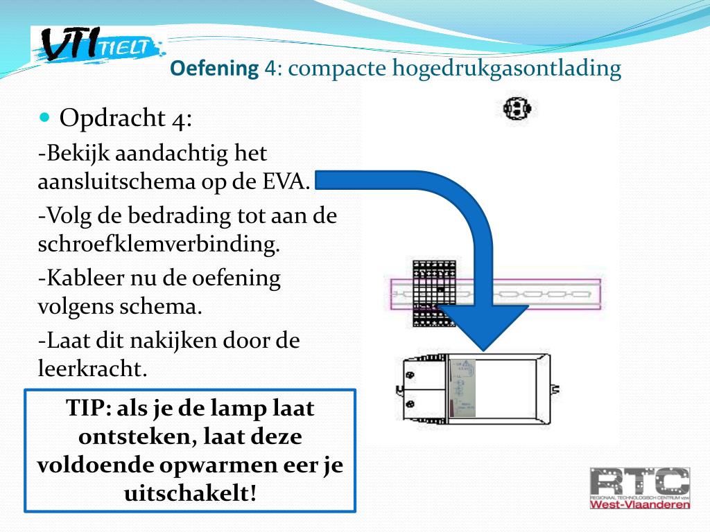 Oefening 4: compacte hogedrukgasontlading • Opdracht 4: -Bekijk aandachtig het aansluitschema op de EVA. -Volg de bedrading tot aan de schroefklemverbinding. -Kableer nu de oefening volgens schema. -Laat dit nakijken door de leerkracht. TIP: als je de lamp laat ontsteken, laat deze voldoende opwarmen eer je uitschakelt!