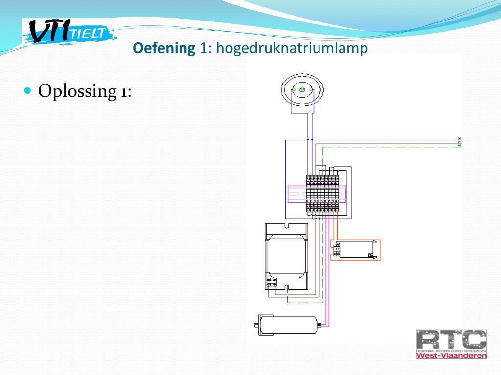 Oefening 1: hogedruknatriumlamp • Opdracht 1: -Bekijk aandachtig het aansluitschema op de ballast. -Volg de bedrading tot aan de schroefklemverbinding. -Kableer nu de oefening volgens schema. -Laat dit nakijken door de leerkracht. TIP: als je de lamp laat ontsteken, laat deze voldoende opwarmen eer je uitschakelt!