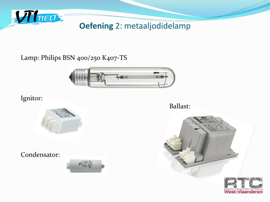 Oefening 2: metaaljodidelamp Lamp: Philips BSN 400/250 K407-TS Ignitor: Ballast: Condensator:
