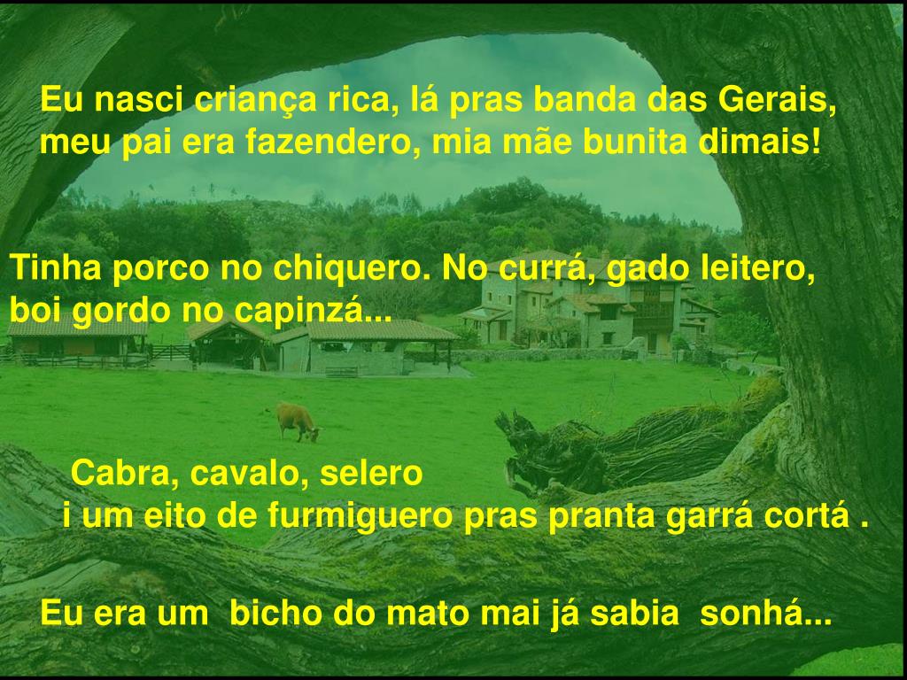 Eu nasci criança rica, lá pras banda das Gerais, meu pai era fazendero, mia mãe bunita dimais! Tinha porco no chiquero. No currá, gado leitero, boi gordo no capinzá... Cabra, cavalo, selero i um eito de furmiguero pras pranta garrá cortá . Eu era um bicho do mato mai já sabia sonhá...
