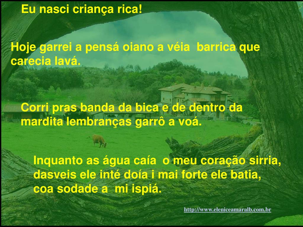 Eu nasci criança rica! Hoje garrei a pensá oiano a véia barrica que carecia lavá. Corri pras banda da bica e de dentro da marditalembranças garrô a voá. Inquanto as água caíao meu coração sirria, dasveis ele inté doía i mai forte ele batia, coa sodade a mi ispiá. http://www.eleniceamaralb.com.br