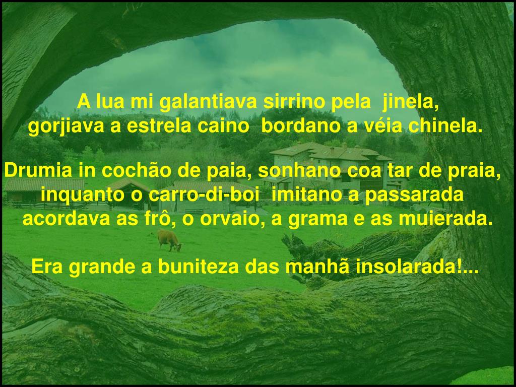 A lua mi galantiava sirrino pela jinela, gorjiava a estrela caino bordano a véia chinela. Drumia in cochão de paia, sonhano coa tar de praia, inquanto o carro-di-boi imitano a passarada acordava as frô, o orvaio, a grama e as muierada. Era grande a buniteza das manhã insolarada!...