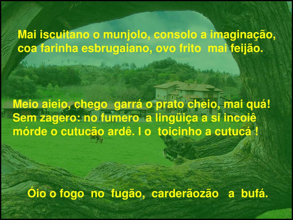 Mai iscuitano o munjolo, consolo a imaginação, coa farinha esbrugaiano, ovo frito mai feijão. Meio aieio, chego garrá o prato cheio, mai quá! Sem zagero: no fumero a lingüiça a si incoiê mórde o cutucão ardê. I o toicinho a cutucá ! Óio o fogo no fugão, carderãozão a bufá.