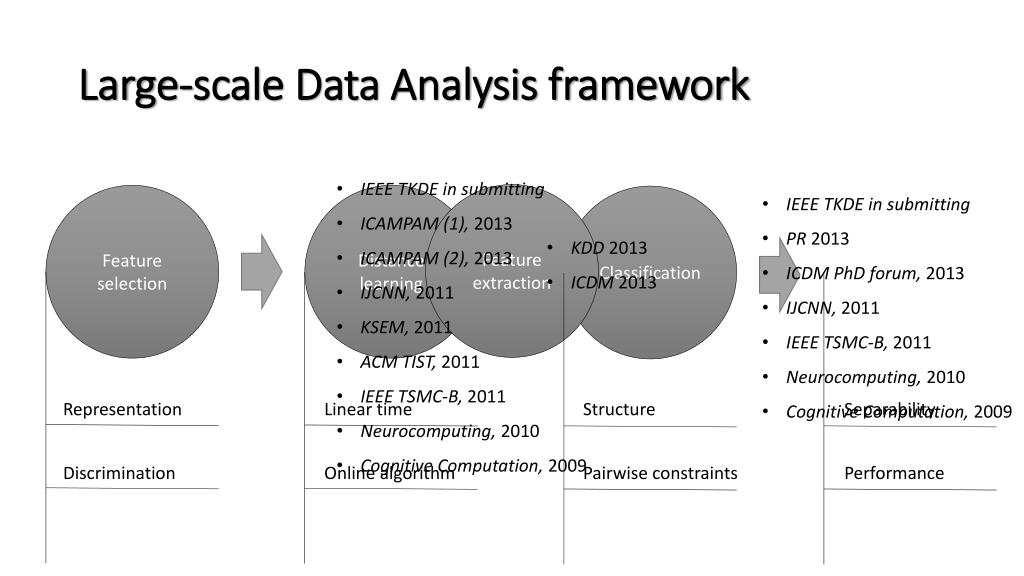 Large-scale Data Analysis framework • IEEE TKDE in submitting • ICAMPAM (1),2013 • ICAMPAM (2),2013 • IJCNN,2011 • KSEM,2011 • ACM TIST, 2011 • IEEE TSMC-B, 2011 • Neurocomputing,2010 • Cognitive Computation, 2009 • IEEE TKDE in submitting • PR 2013 • ICDM PhD forum, 2013 • IJCNN, 2011 • IEEE TSMC-B, 2011 • Neurocomputing, 2010 • Cognitive Computation, 2009 Feature extraction Feature selection Distance learning Classification • KDD 2013 • ICDM 2013 Representation Linear time Structure Separability Discrimination Online algorithm Pairwise constraints Performance