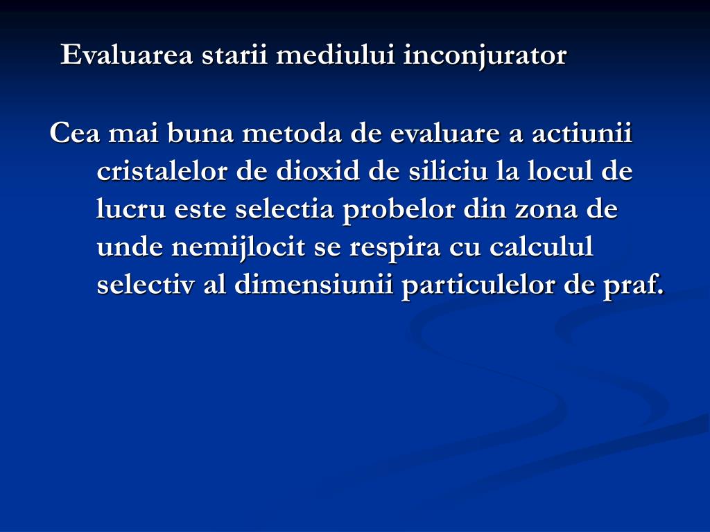 Evaluarea starii mediului inconjurator Cea mai buna metoda de evaluare a actiunii cristalelor de dioxid de siliciu la locul de lucru este selectia probelor din zona de unde nemijlocit se respira cu calculul selectiv al dimensiunii particulelor de praf.