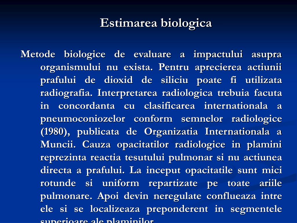 Estimarea biologica Metode biologice de evaluare a impactului asupra organismului nu exista. Pentru aprecierea actiunii prafului de dioxid de siliciu poate fi utilizata radiografia. Interpretarea radiologica trebuia facuta in concordanta cu clasificarea internationala a pneumoconiozelor conform semnelor radiologice (1980), publicata de Organizatia Internationala a Muncii. Cauza opacitatilor radiologice in plamini reprezinta reactia tesutului pulmonar si nu actiunea directa a prafului. La inceput opacitatile sunt mici rotunde si uniform repartizate pe toate ariile pulmonare. Apoi devin neregulate conflueaza intre ele si se localizeaza preponderent in segmentele superioare ale plaminilor.