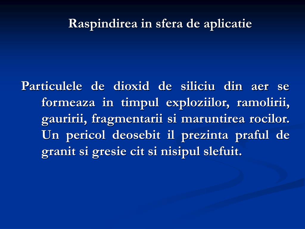 Raspindirea in sfera de aplicatie Particulele de dioxid de siliciu din aer se formeaza in timpul exploziilor, ramolirii, gauririi, fragmentarii si maruntirea rocilor. Un pericol deosebit il prezinta praful de granit si gresie cit si nisipul slefuit.