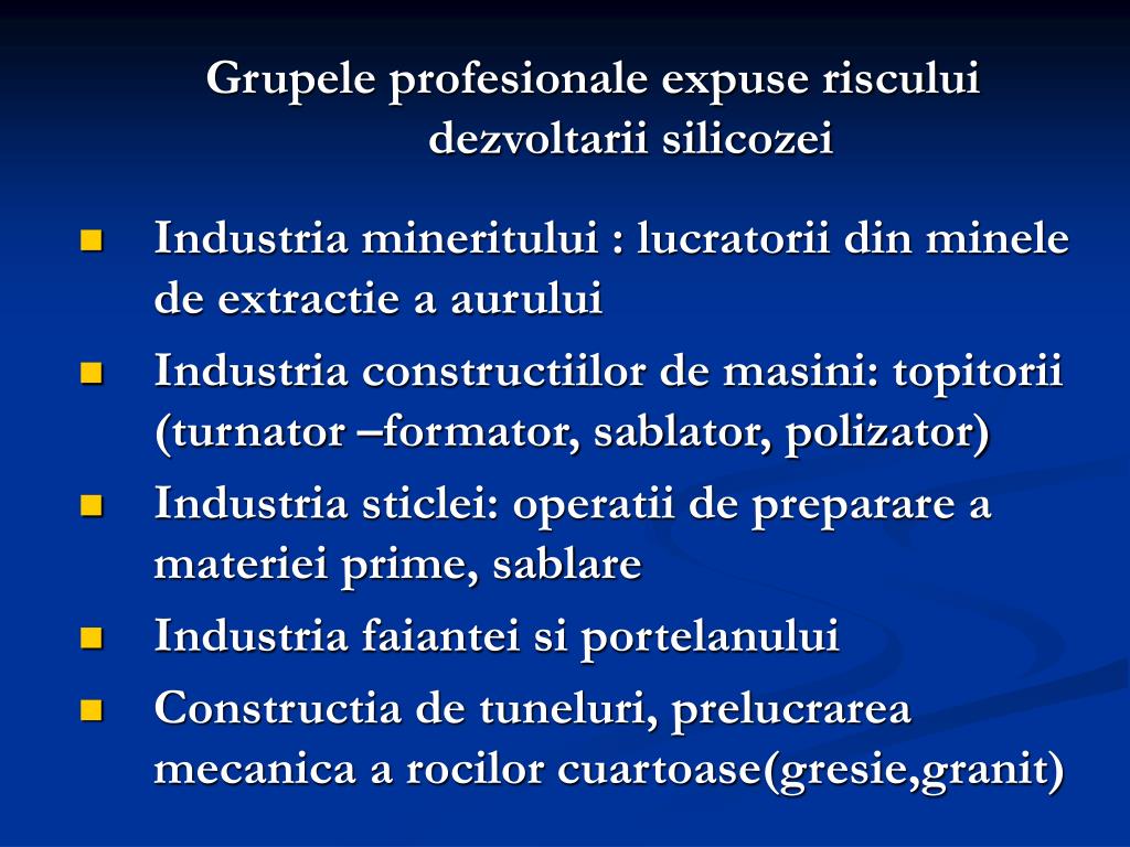 Grupele profesionale expuse riscului dezvoltarii silicozei • Industria mineritului : lucratorii din minele de extractie a aurului • Industria constructiilor de masini: topitorii (turnator –formator, sablator, polizator) • Industria sticlei: operatii de preparare a materiei prime, sablare • Industria faiantei si portelanului • Constructia de tuneluri, prelucrarea mecanica a rocilor cuartoase(gresie,granit)