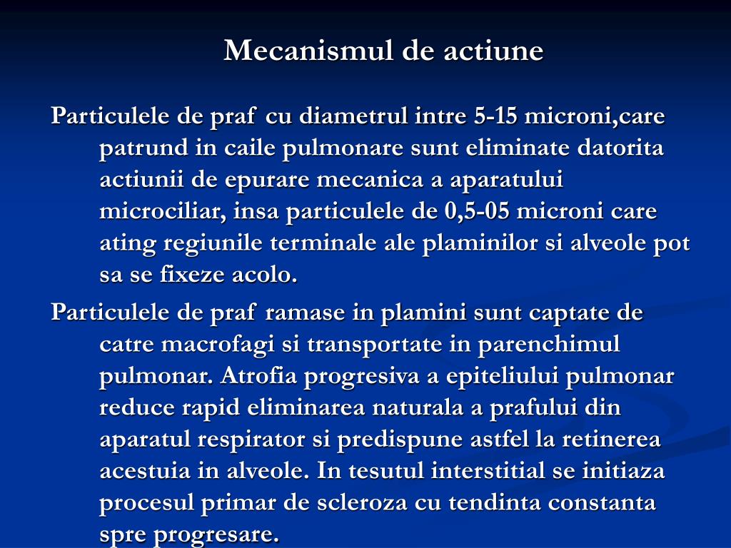 Mecanismul de actiune Particulele de praf cu diametrul intre 5-15 microni,care patrund in caile pulmonare sunt eliminate datorita actiunii de epurare mecanica a aparatului microciliar, insa particulele de 0,5-05 microni care ating regiunile terminale ale plaminilor si alveole pot sa se fixeze acolo. Particulele de praf ramase in plamini sunt captate de catre macrofagi si transportate in parenchimul pulmonar. Atrofia progresiva a epiteliului pulmonar reduce rapid eliminarea naturala a prafului din aparatul respirator si predispune astfel la retinerea acestuia in alveole. In tesutul interstitial se initiaza procesul primar de scleroza cu tendinta constanta spre progresare.