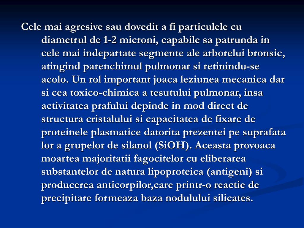 Cele mai agresive sau dovedit a fi particulele cu diametrul de 1-2 microni, capabile sa patrunda in cele mai indepartate segmente ale arborelui bronsic, atingind parenchimul pulmonar si retinindu-se acolo. Un rol important joaca leziunea mecanica dar si cea toxico-chimica a tesutului pulmonar, insa activitatea prafului depinde in mod direct de structura cristalului si capacitatea de fixare de proteinele plasmatice datorita prezentei pe suprafata lor a grupelor de silanol (SiOH). Aceasta provoaca moartea majoritatii fagocitelor cu eliberarea substantelor de natura lipoproteica (antigeni) si producerea anticorpilor,care printr-o reactie de precipitare formeaza baza nodulului silicates.