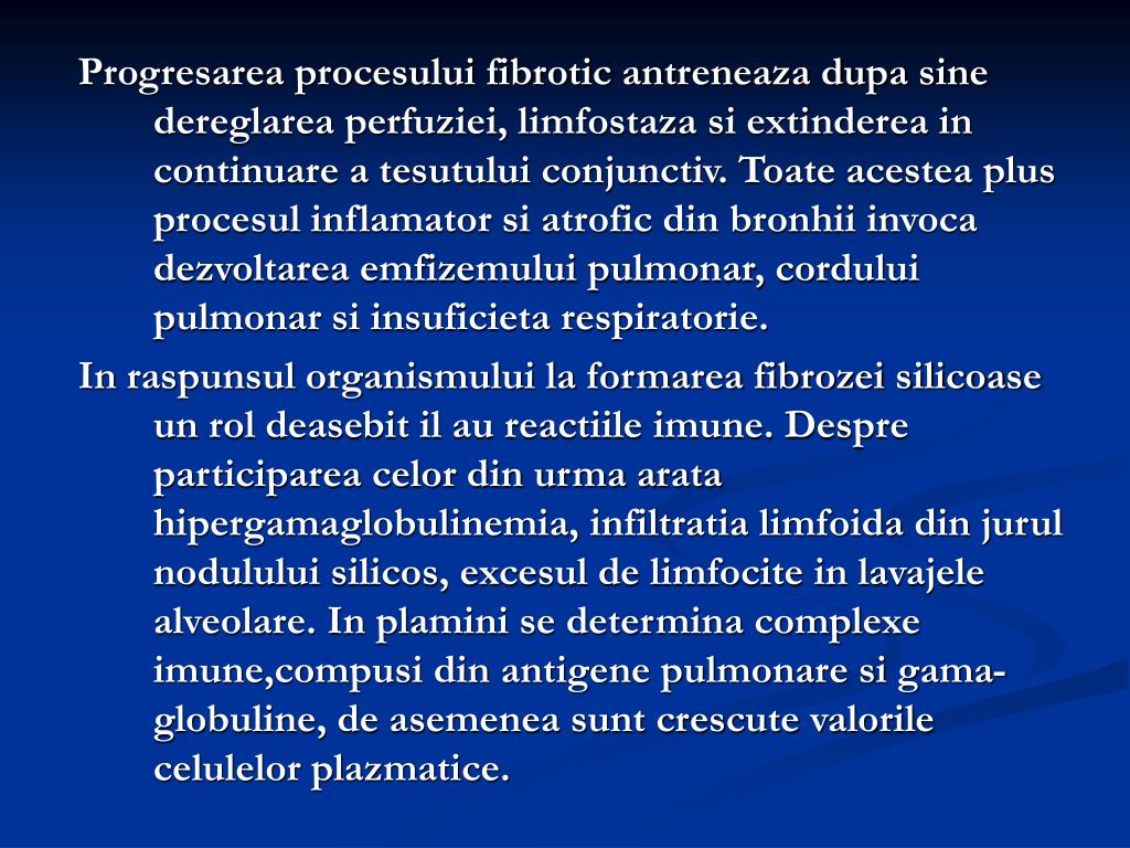 Progresarea procesului fibrotic antreneaza dupa sine dereglarea perfuziei, limfostaza si extinderea in continuare a tesutului conjunctiv. Toate acestea plus procesul inflamator si atrofic din bronhii invoca dezvoltarea emfizemului pulmonar, cordului pulmonar si insuficieta respiratorie. In raspunsul organismului la formarea fibrozei silicoase un rol deasebit il au reactiile imune. Despre participarea celor din urma arata hipergamaglobulinemia, infiltratia limfoida din jurul nodulului silicos, excesul de limfocite in lavajele alveolare. In plamini se determina complexe imune,compusi din antigene pulmonare si gama-globuline, de asemenea sunt crescute valorile celulelor plazmatice.