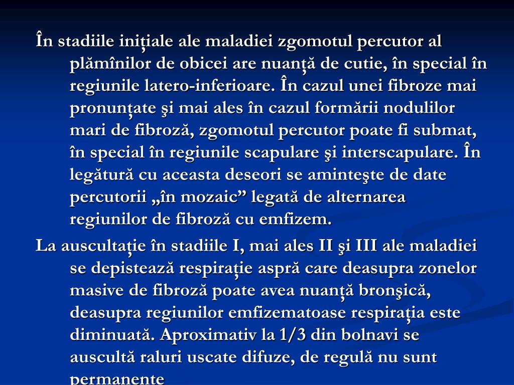 În stadiile iniţiale ale maladiei zgomotul percutor al plămînilor de obicei are nuanţă de cutie, în special în regiunile latero-inferioare. În cazul unei fibroze mai pronunţate şi mai ales în cazul formării nodulilor mari de fibroză, zgomotul percutor poate fi submat, în special în regiunile scapulare şi interscapulare. În legătură cu aceasta deseori se aminteşte de date percutorii „în mozaic” legată de alternarea regiunilor de fibroză cu emfizem. La auscultaţie în stadiile I, mai ales II şi III ale maladiei se depistează respiraţie aspră care deasupra zonelor masive de fibroză poate avea nuanţă bronşică, deasupra regiunilor emfizematoase respiraţia este diminuată. Aproximativ la 1/3 din bolnavi se auscultă raluri uscate difuze, de regulă nu sunt permanente