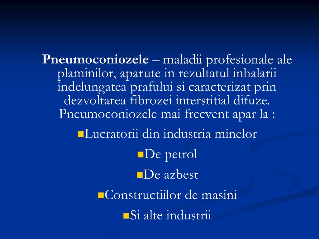 Pneumoconiozele – maladii profesionale ale plaminilor, aparute in rezultatul inhalarii indelungatea prafului si caracterizat prin dezvoltarea fibrozei interstitial difuze. Pneumoconiozele mai frecvent apar la : • Lucratorii din industria minelor • De petrol • De azbest • Constructiilor de masini • Si alte industrii