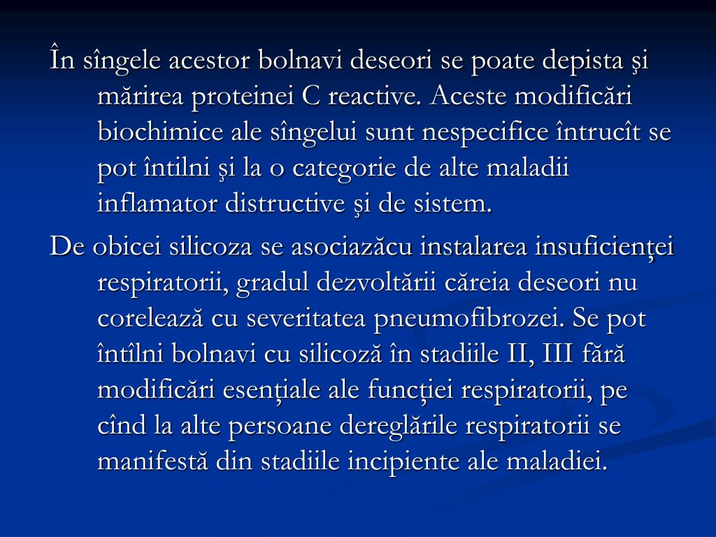 În sîngele acestor bolnavi deseori se poate depista şi mărirea proteinei C reactive. Aceste modificări biochimice ale sîngelui sunt nespecifice întrucît se pot întilni şi la o categorie de alte maladii inflamator distructive şi de sistem. De obicei silicoza se asociazăcu instalarea insuficienţei respiratorii, gradul dezvoltării căreia deseori nu corelează cu severitatea pneumofibrozei. Se pot întîlni bolnavi cu silicoză în stadiile II, III fără modificări esenţiale ale funсţiei respiratorii, pe cînd la alte persoane dereglările respiratorii se manifestă din stadiile incipiente ale maladiei.