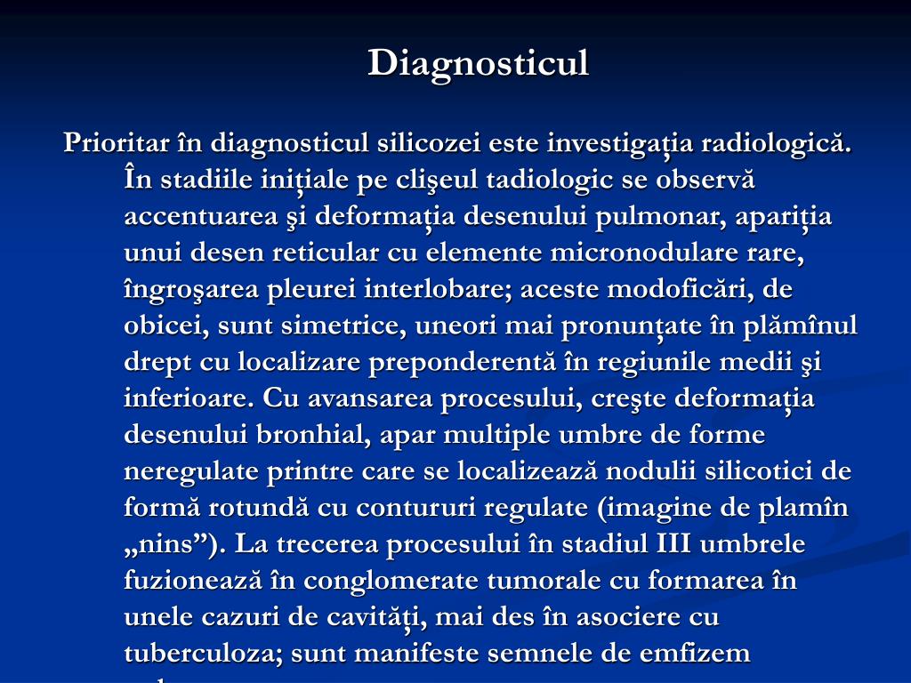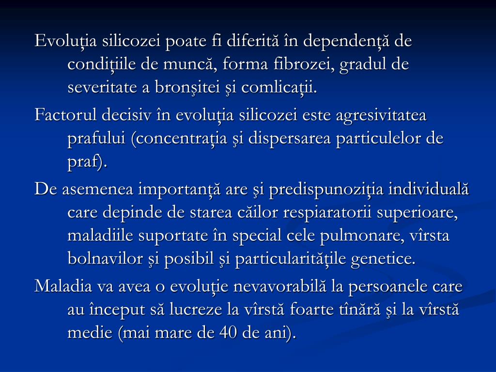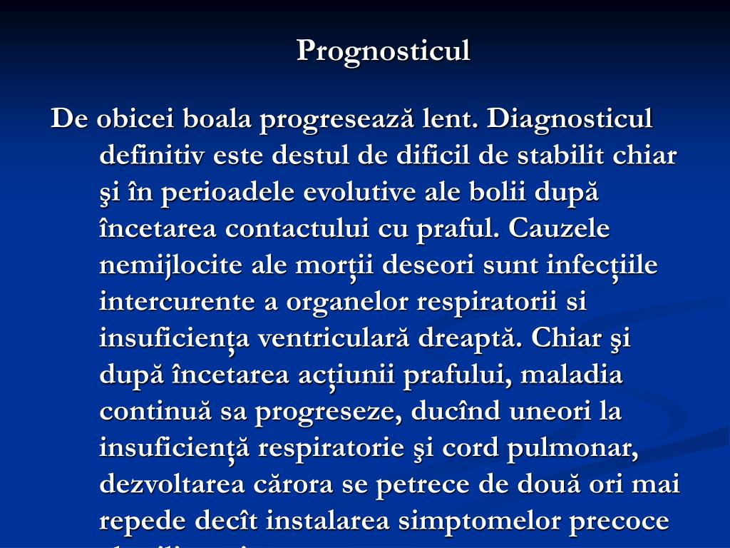 Prognosticul De obicei boala progresează lent. Diagnosticul definitiv este destul de dificil de stabilit chiar şi în perioadele evolutive ale bolii după încetarea contactului cu praful. Cauzele nemijlocite ale morţii deseori sunt infecţiile intercurente a organelor respiratorii si insuficienţa ventriculară dreaptă. Chiar şi după încetarea acţiunii prafului, maladia continuă sa progreseze, ducînd uneori la insuficienţă respiratorie şi cord pulmonar, dezvoltarea cărora se petrece de două ori mai repede decît instalarea simptomelor precoce ale silicozei.