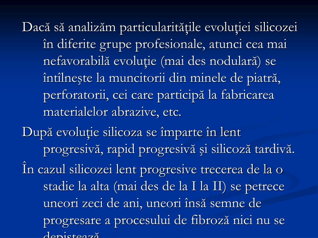 Dacă să analizăm particularităţile evoluţiei silicozei în diferite grupe profesionale, atunci cea mai nefavorabilă evoluţie (mai des nodulară) se întîlneşte la muncitorii din minele de piatră, perforatorii, cei care participă la fabricarea materialelor abrazive, etc. După evoluţie silicoza se împarte în lent progresivă, rapid progresivă şi silicoză tardivă. În cazul silicozei lent progresive trecerea de la o stadie la alta (mai des de la I la II) se petrece uneori zeci de ani, uneori însă semne de progresare a procesului de fibroză nici nu se depistează.