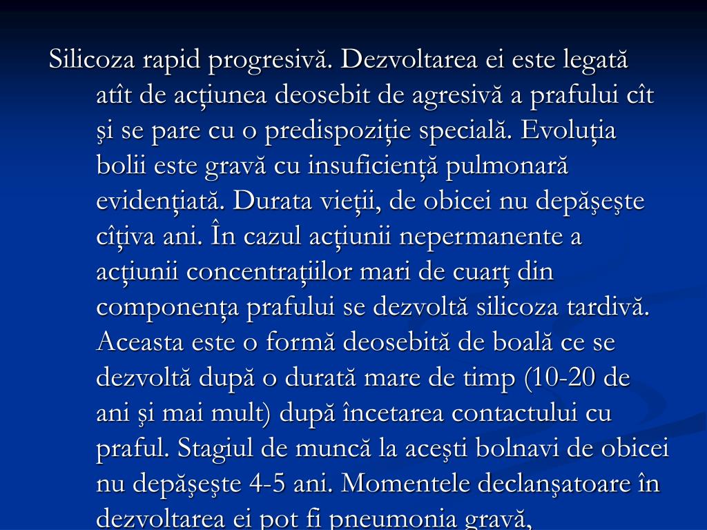 Silicoza rapid progresivă. Dezvoltarea ei este legată atît de acţiunea deosebit de agresivă a prafului cît şi se pare cu o predispoziţie specială. Evoluţia bolii este gravă cu insuficienţă pulmonară evidenţiată. Durata vieţii, de obicei nu depăşeşte cîţiva ani. În cazul acţiunii nepermanente a acţiunii concentraţiilor mari de cuarţ din componenţa prafului se dezvoltă silicoza tardivă. Aceasta este o formă deosebită de boală ce se dezvoltă după o durată mare de timp (10-20 de ani şi mai mult) după încetarea contactului cu praful. Stagiul de muncă la aceşti bolnavi de obicei nu depăşeşte 4-5 ani. Momentele declanşatoare în dezvoltarea ei pot fi pneumonia gravă, tuberculoza, artrita reumatoidă.