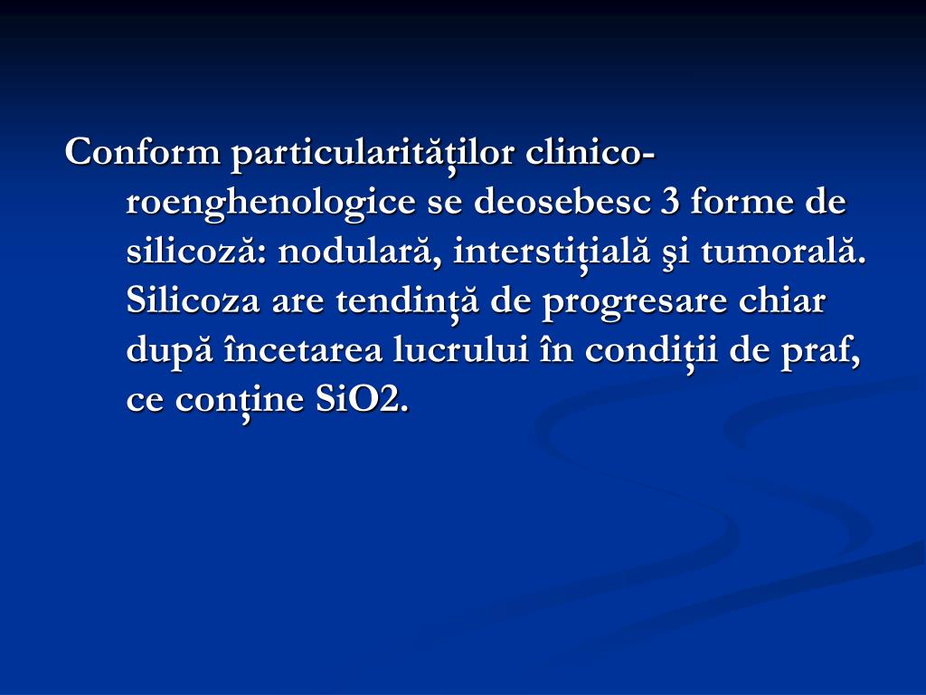 Conform particularităţilor clinico-roenghenologice se deosebesc 3 forme de silicoză: nodulară, interstiţială şi tumorală. Silicoza are tendinţă de progresare chiar după încetarea lucrului în condiţii de praf, ce conţine SiO2.