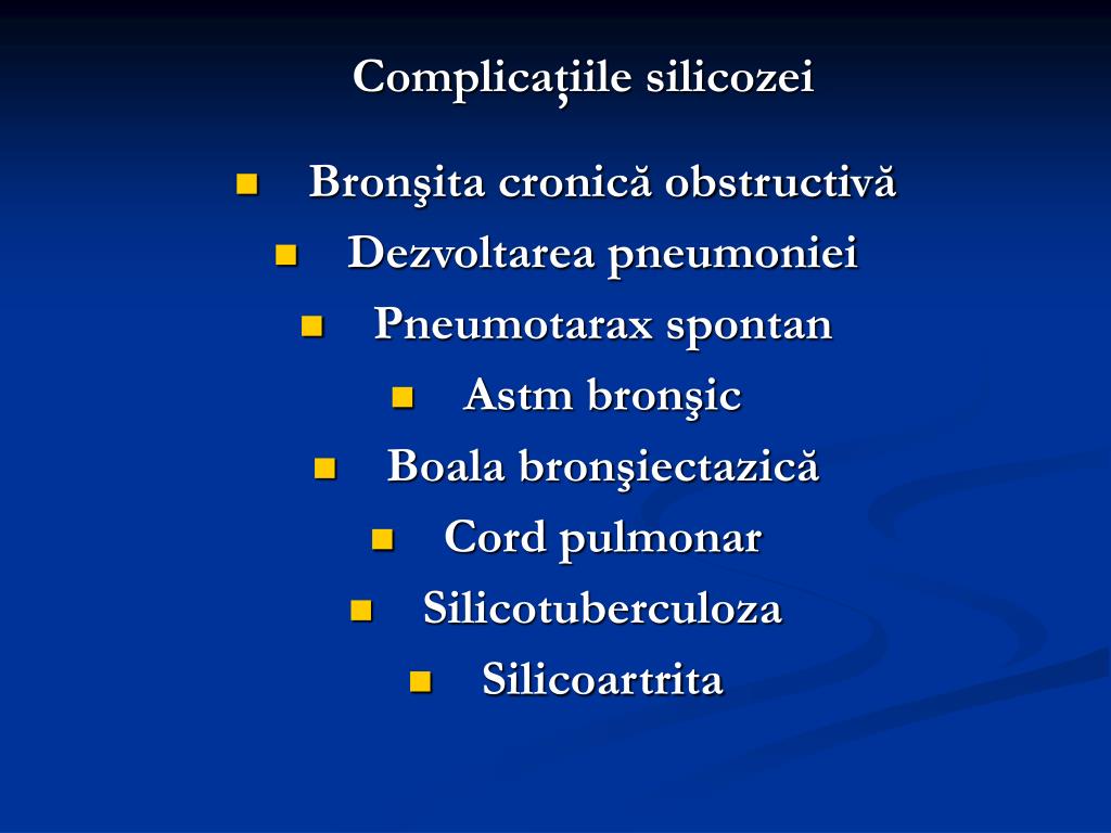 Complicaţiile silicozei • Bronşita cronică obstructivă • Dezvoltarea pneumoniei • Pneumotarax spontan • Astm bronşic • Boala bronşiectazică • Cord pulmonar • Silicotuberculoza • Silicoartrita