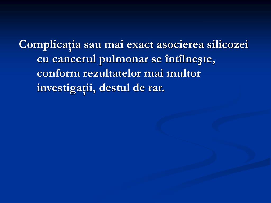Complicaţia sau mai exact asocierea silicozei cu cancerul pulmonar se întîlneşte, conform rezultatelor mai multor investigaţii, destul de rar.
