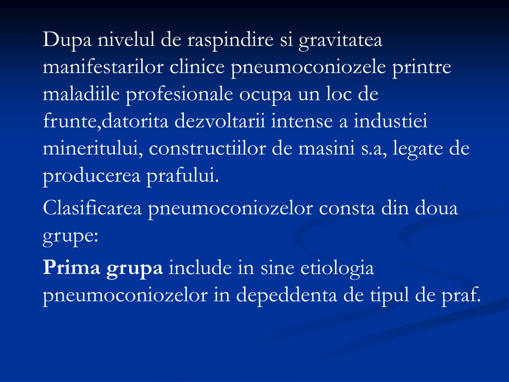 Dupa nivelul de raspindire si gravitatea manifestarilor clinice pneumoconiozele printre maladiile profesionale ocupa un loc de frunte,datorita dezvoltarii intense a industiei mineritului, constructiilor de masini s.a, legate de producerea prafului. Clasificarea pneumoconiozelor consta din doua grupe: Prima grupa include in sine etiologia pneumoconiozelor in depeddenta de tipul de praf.