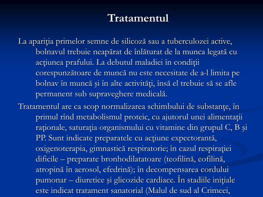 Tratamentul La apariţia primelor semne de silicoză sau a tuberculozei active, bolnavul trebuie neapărat de înlăturat de la munca legată cu acţiunea prafului. La debutul maladiei în condiţii corespunzătoare de muncă nu este necesitate de a-l limita pe bolnav în muncă şi în alte activităţi, însă el trebuie să se afle permanent sub supraveghere medicală. Tratamentul are ca scop normalizarea schimbului de substanţe, în primul rînd metabolismul proteic, cu ajutorul unei alimentaţii raţionale, saturaţia organismului cu vitamine din grupul C, B şi PP. Sunt indicate preparatele cu acţiune expectorantă, oxigenoterapia, gimnastică respiratorie; în cazul respiraţiei dificile – preparate bronhodilatatoare (teofilină, eofilină, atropină în aerosol, efedrină); în decompensarea cordului pumonar – diuretice şi glicozide cardiace. În stadiile iniţiale este indicat tratament sanatorial (Malul de sud al Crimeei, Kislovodsc, Kazakstan etc.).