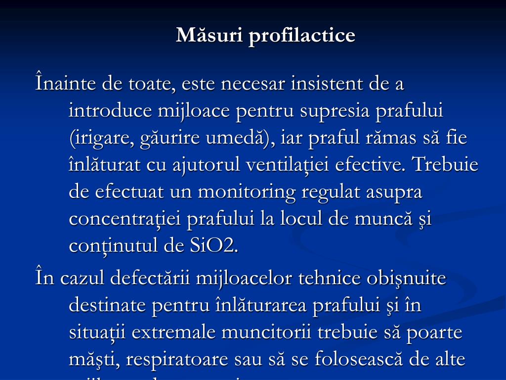 Măsuri profilactice Înainte de toate, este necesar insistent de a introduce mijloace pentru supresia prafului (irigare, găurire umedă), iar praful rămas să fie înlăturat cu ajutorul ventilaţiei efective. Trebuie de efectuat un monitoring regulat asupra concentraţiei prafului la locul de muncă şi conţinutul de SiO2. În cazul defectării mijloacelor tehnice obişnuite destinate pentru înlăturarea prafului şi în situaţii extremale muncitorii trebuie să poarte măşti, respiratoare sau să se folosească de alte mijloace de protecţie.