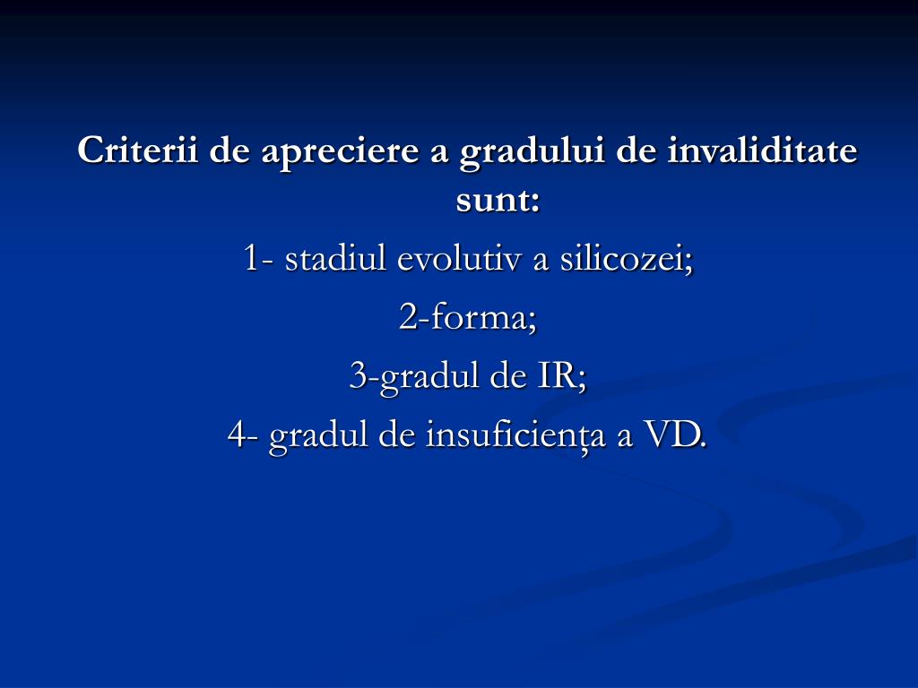 Criterii de apreciere a gradului de invaliditate sunt: 1- stadiul evolutiv a silicozei; 2-forma; 3-gradul de IR; 4- gradul de insuficienţa a VD.