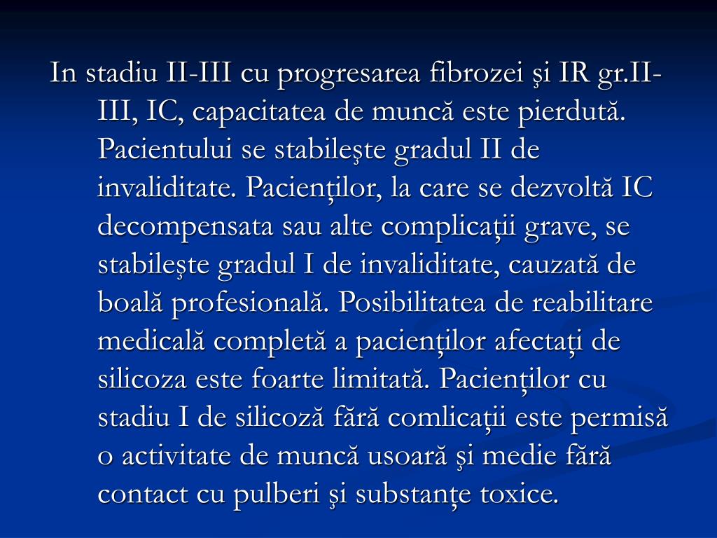 Pacienţilor cu stadiu II, şi III- dacă starea generală este satisfăcătoare, IR gr.I-II este permisă o activitate de muncă uşoară, fără contact cu pulberi şi substanţe toxice.
