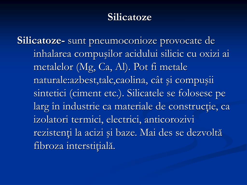 Silicatoze Silicatoze- sunt pneumoconioze provocate de inhalarea compuşilor acidului silicic cu oxizi ai metalelor (Mg, Ca, Al). Pot fi metale naturale:azbest,talc,caolina, cât şi compuşii sintetici (ciment etc.). Silicatele se folosesc pe larg în industrie ca materiale de construcţie, ca izolatori termici, electrici, anticorozivi rezistenţi la acizi şi baze. Mai des se dezvoltă fibroza interstiţială.