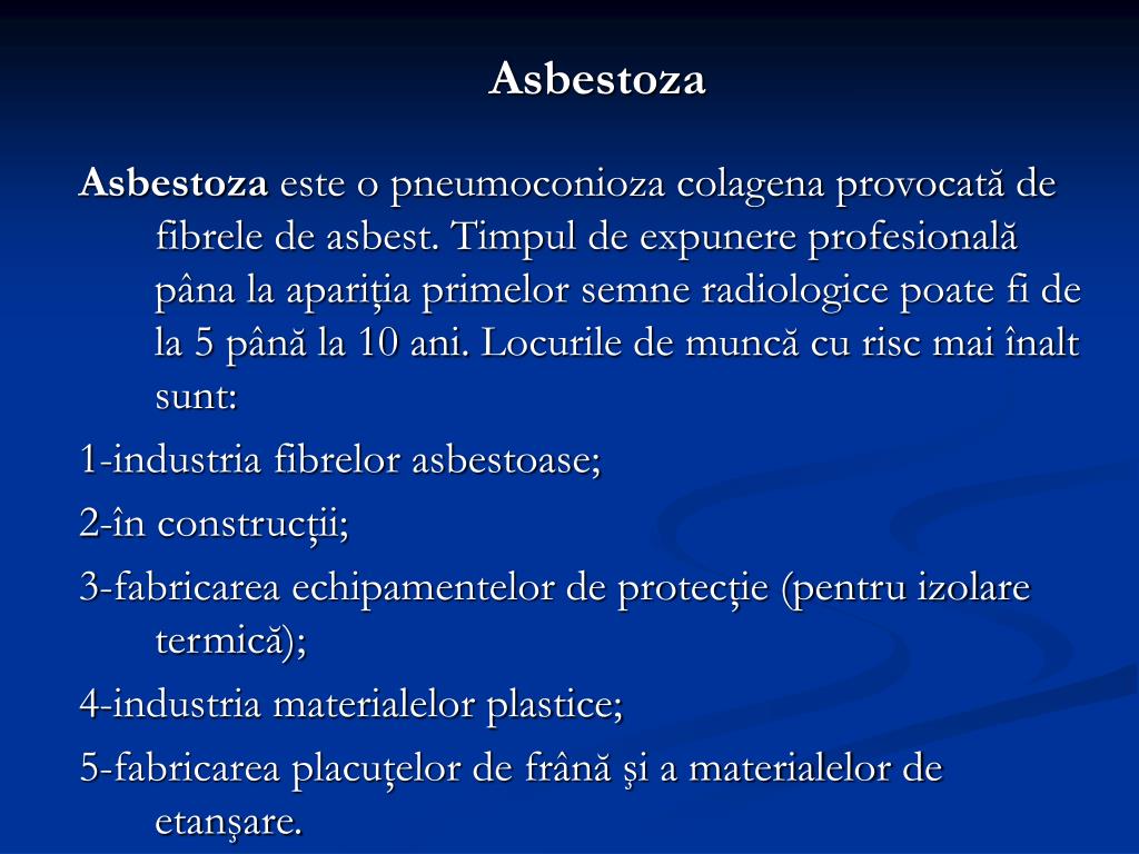 Asbestoza Asbestoza este o pneumoconioza colagena provocată de fibrele de asbest. Timpul de expunere profesională pâna la apariţia primelor semne radiologice poate fi de la 5 până la 10 ani. Locurile de muncă cu risc mai înalt sunt: 1-industria fibrelor asbestoase; 2-în construcţii; 3-fabricarea echipamentelor de protecţie (pentru izolare termică); 4-industria materialelor plastice; 5-fabricarea placuţelor de frână şi a materialelor de etanşare.
