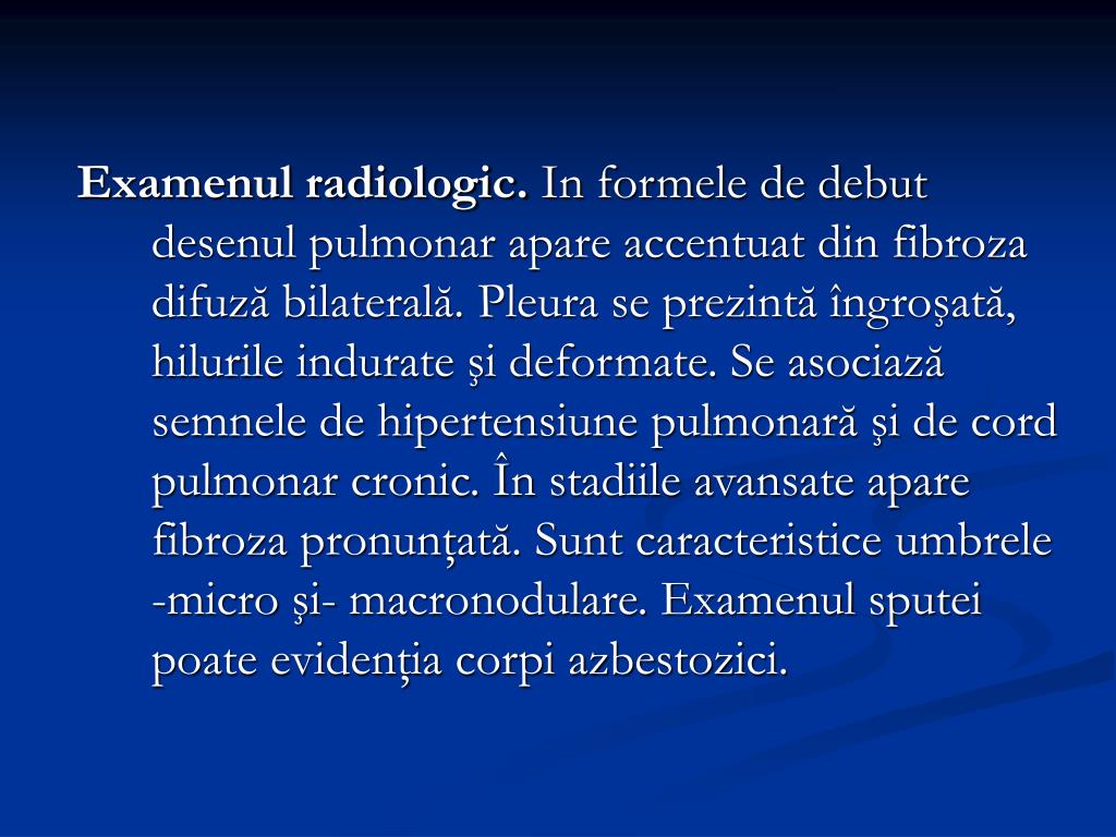 Examenul radiologic. In formele de debut desenul pulmonar apare accentuat din fibroza difuză bilaterală. Pleura se prezintă îngroşată, hilurile indurate şi deformate. Se asociază semnele de hipertensiune pulmonară şi de cord pulmonar cronic. În stadiile avansate apare fibroza pronunţată. Sunt caracteristice umbrele -micro şi- macronodulare. Examenul sputei poate evidenţia corpi azbestozici.