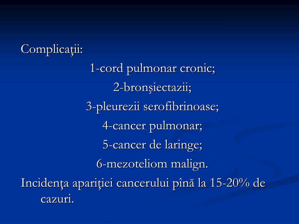 Complicaţii: 1-cord pulmonar cronic; 2-bronşiectazii; 3-pleurezii serofibrinoase; 4-cancer pulmonar; 5-cancer de laringe; 6-mezoteliom malign. Incidenţa apariţiei cancerului pînă la 15-20% de cazuri.