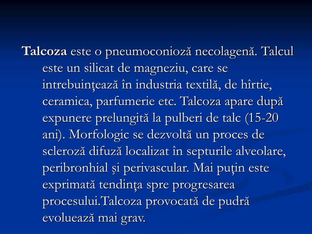 Talcoza este o pneumoconioză necolagenă. Talcul este un silicat de magneziu, care se intrebuinţează în industria textilă, de hîrtie, ceramica, parfumerie etc. Talcoza apare după expunere prelungită la pulberi de talc (15-20 ani). Morfologic se dezvoltă un proces de scleroză difuză localizat în septurile alveolare, peribronhial şi perivascular. Mai puţin este exprimată tendinţa spre progresarea procesului.Talcoza provocată de pudră evoluează mai grav.