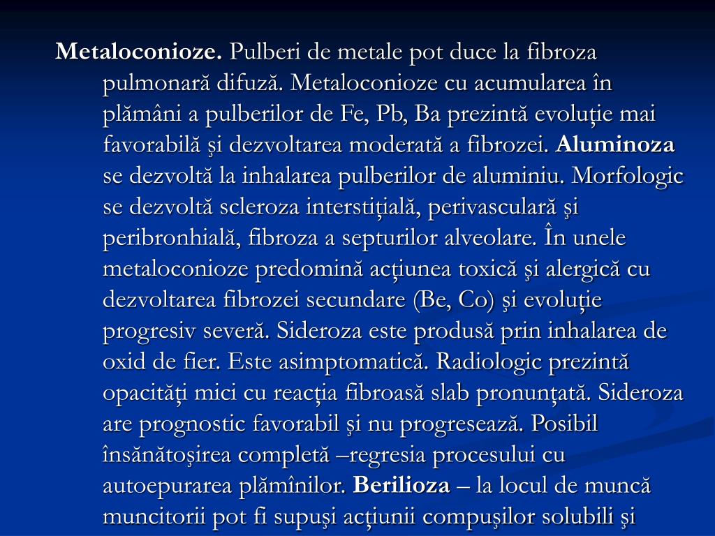 Metaloconioze. Pulberi de metale pot duce la fibroza pulmonară difuză. Metaloconioze cu acumularea în plămâni a pulberilor de Fe, Pb, Ba prezintă evoluţie mai favorabilă şi dezvoltarea moderată a fibrozei. Aluminoza se dezvoltă la inhalarea pulberilor de aluminiu. Morfologic se dezvoltă scleroza interstiţială, perivasculară şi peribronhială, fibroza a septurilor alveolare. În unele metaloconioze predomină acţiunea toxică şi alergică cu dezvoltarea fibrozei secundare (Be, Co) şi evoluţie progresiv severă. Sideroza este produsă prin inhalarea de oxid de fier. Este asimptomatică. Radiologic prezintă opacităţi mici cu reacţia fibroasă slab pronunţată. Sideroza are prognostic favorabil şi nu progresează. Posibil însănătoşirea completă –regresia procesului cu autoepurarea plămînilor. Berilioza – la locul de muncă muncitorii pot fi supuşi acţiunii compuşilor solubili şi insolubili de beriliu.