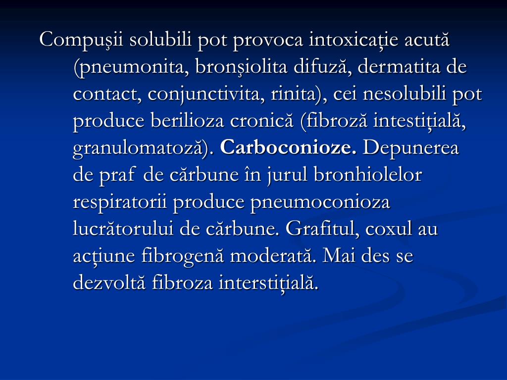 Compuşii solubili pot provoca intoxicaţie acută (pneumonita, bronşiolita difuză, dermatita de contact, conjunctivita, rinita), cei nesolubili pot produce berilioza cronică (fibroză intestiţială, granulomatoză). Carboconioze. Depunerea de praf de cărbune în jurul bronhiolelor respiratorii produce pneumoconioza lucrătorului de cărbune. Grafitul, coxul au acţiune fibrogenă moderată. Mai des se dezvoltă fibroza interstiţială.