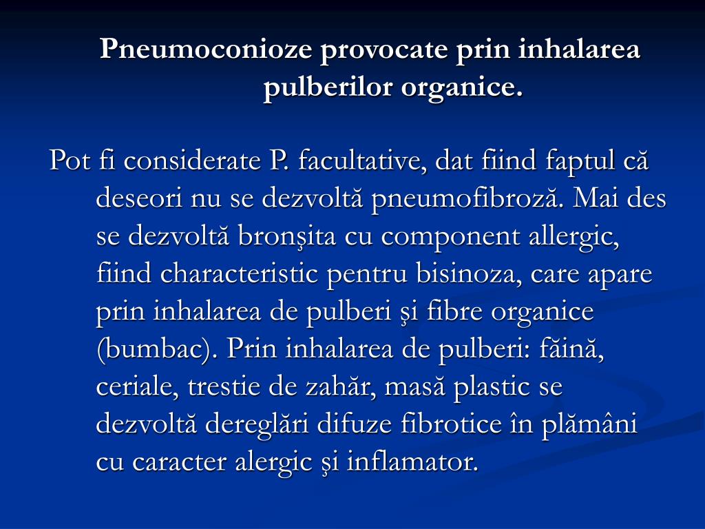 Pneumoconioze provocate prin inhalarea pulberilor organice. Pot fi considerate P. facultative, dat fiind faptul că deseori nu se dezvoltă pneumofibroză. Mai des se dezvoltă bronşita cu component allergic, fiind characteristic pentru bisinoza, care apare prin inhalarea de pulberi şi fibre organice (bumbac). Prin inhalarea de pulberi: făină, ceriale, trestie de zahăr, masă plastic se dezvoltă dereglări difuze fibrotice în plămâni cu caracter alergic şi inflamator.