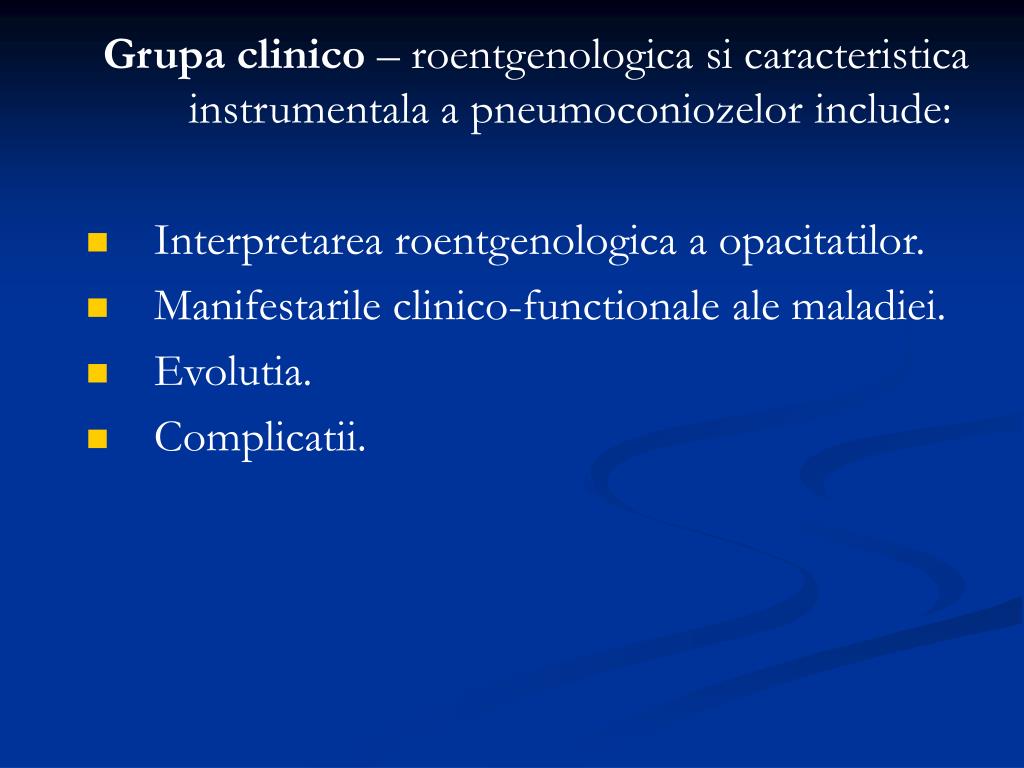Grupa clinico – roentgenologica si caracteristica instrumentala a pneumoconiozelor include: • Interpretarea roentgenologica a opacitatilor. • Manifestarile clinico-functionale ale maladiei. • Evolutia. • Complicatii.