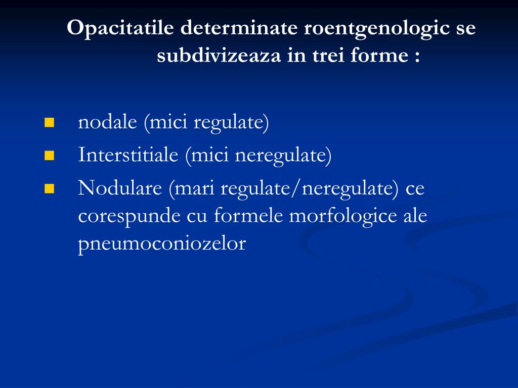 Opacitatile determinate roentgenologic se subdivizeaza in trei forme : • nodale (mici regulate) • Interstitiale (mici neregulate) • Nodulare (mari regulate/neregulate) ce corespunde cu formele morfologice ale pneumoconiozelor
