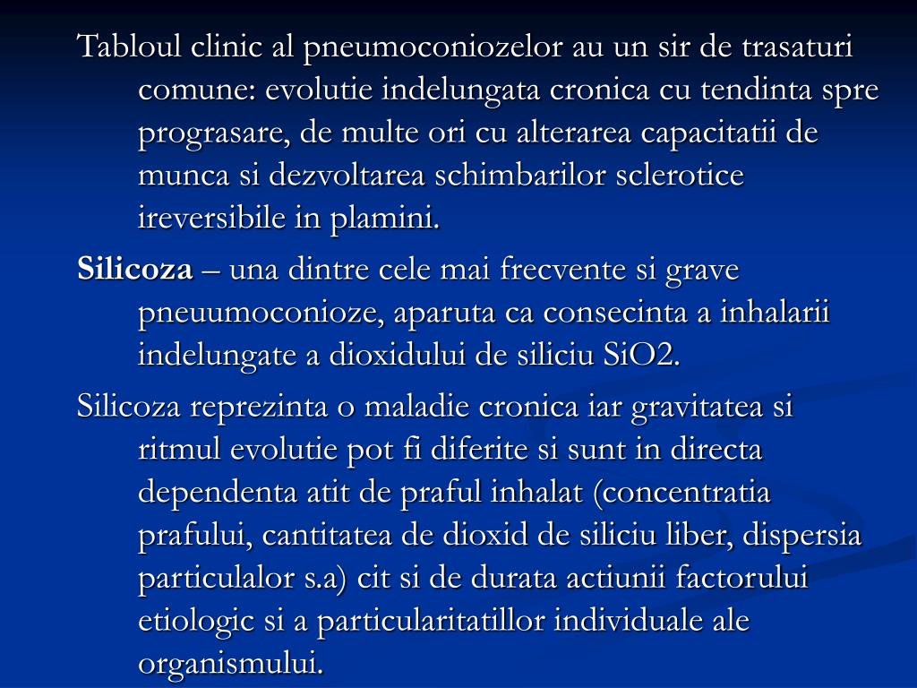 Tabloul clinic al pneumoconiozelor au un sir de trasaturi comune: evolutie indelungata cronica cu tendinta spre prograsare, de multe ori cu alterarea capacitatii de munca si dezvoltarea schimbarilor sclerotice ireversibile in plamini. Silicoza – una dintre cele mai frecvente si grave pneuumoconioze, aparuta ca consecinta a inhalarii indelungate a dioxidului de siliciu SiO2. Silicoza reprezinta o maladie cronica iar gravitatea si ritmul evolutie pot fi diferite si sunt in directa dependenta atit de praful inhalat (concentratia prafului, cantitatea de dioxid de siliciu liber, dispersia particulalor s.a) cit si de durata actiunii factorului etiologic si a particularitatillor individuale ale organismului.