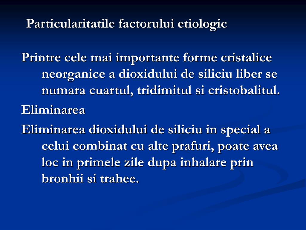 Particularitatile factorului etiologic Printre cele mai importante forme cristalice neorganice a dioxidului de siliciu liber se numara cuartul, tridimitul si cristobalitul. Eliminarea Eliminarea dioxidului de siliciu in special a celui combinat cu alte prafuri, poate avea loc in primele zile dupa inhalare prin bronhii si trahee.